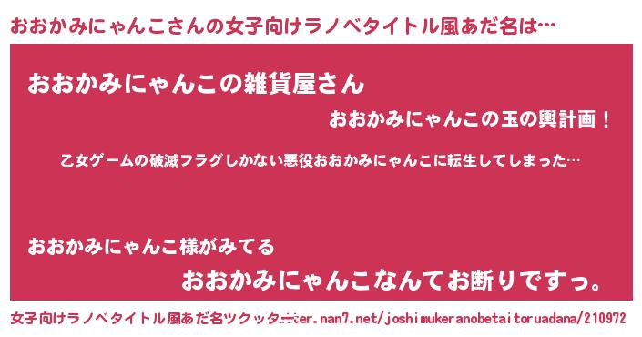 | 男性向けラノベタイトル風あだ名 | 『この素晴らしい世界におおかみにゃんこを!』 |