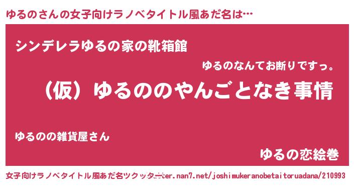 | 男性向けラノベタイトル風あだ名 | 『ゆるのの憂鬱』『緋弾のユルノ』 |
