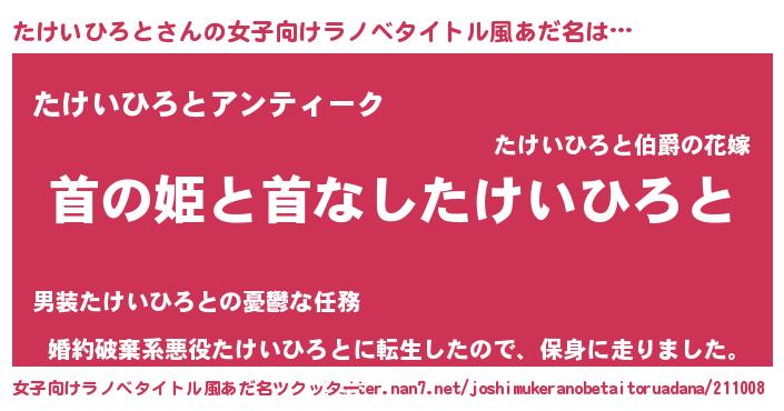 たけいひろとさんの女子向けラノベタイトル風あだ名は… 『首の姫と首なしたけいひろと』『たけいひろとアンティーク』『婚約破棄系悪役たけいひろとに転生したので、保身に走りました。』 ツクッター #女子向けラノベタイトル風あだ名ツクッター http://tkutter.nan7.net/joshimukeranobetaitoruadana/211008/