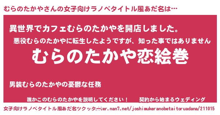| 男性向けラノベタイトル風あだ名 | 『おまえをオタクにしてやるから、俺をむらのたかやにしてくれ! 』 |