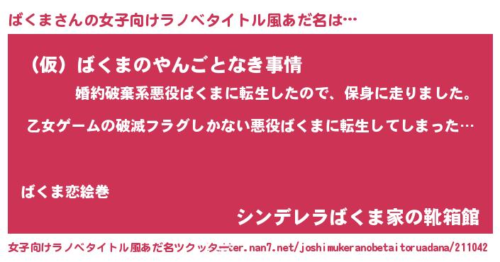 | 男性向けラノベタイトル風あだ名 | 『この素晴らしい世界にばくまを!』 |
