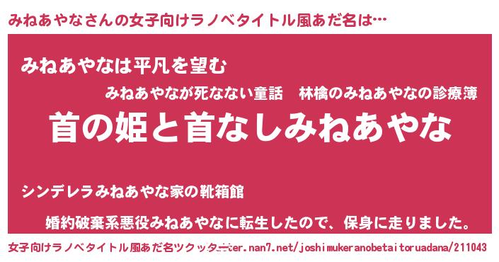 | 胡散臭い通販商品みたいなあだ名 | 『信頼と実績のサプリメント…その名も「みねあやな」』 |