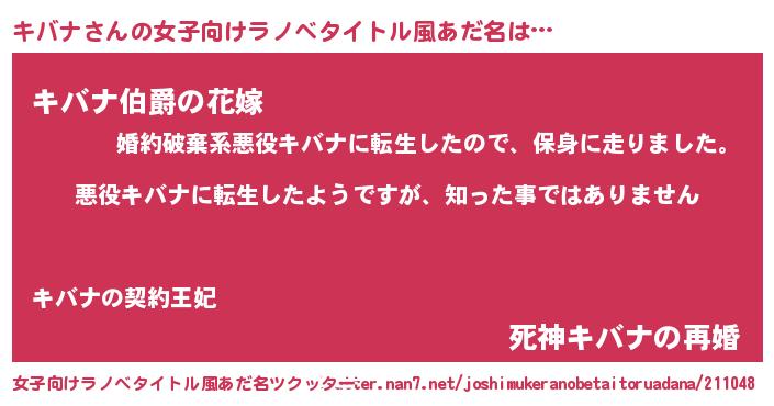 | 男性向けラノベタイトル風あだ名 | 『この素晴らしい世界にキバナを!』 |