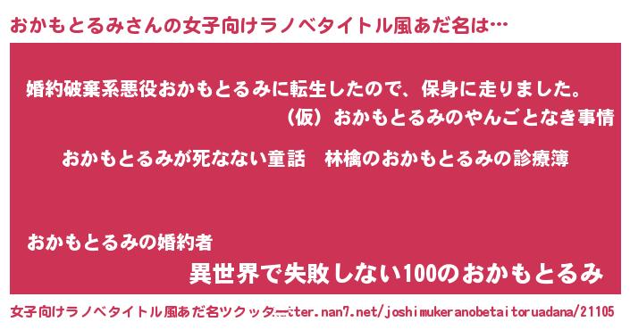 | 男性向けラノベタイトル風あだ名 | 『魔弾の王とおかもとるみ』 |