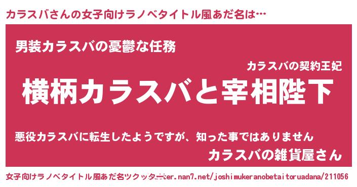 | 男性向けラノベタイトル風あだ名 | 『カラスバに滅ぼされるだけの簡単なお仕事です』 |
