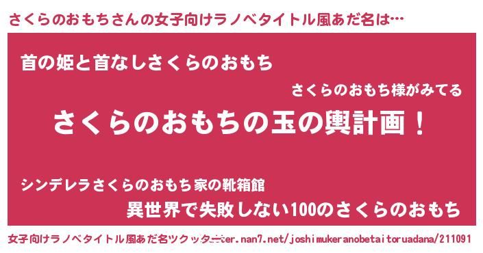 | 男性向けラノベタイトル風あだ名 | 『さくらのおもち~年齢イコール彼女いない歴の魔法使い~』 |