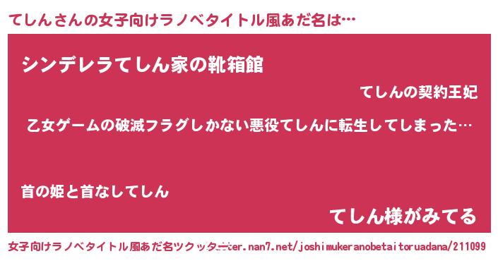 | 男性向けラノベタイトル風あだ名 | 『この素晴らしい世界にてしんを!』 |