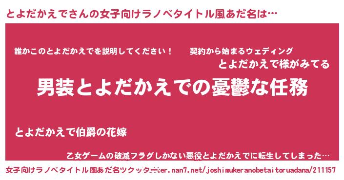 とよだかえでさんの女子向けラノベタイトル風あだ名は… 『男装とよだかえでの憂鬱な任務』『誰かこのとよだかえでを説明してください! ~契約から始まるウェディング~』『乙女ゲームの破滅フラグしかない悪役とよだかえでに転生してしまった…』 ツクッター #女子向けラノベタイトル風あだ名ツクッター http://tkutter.nan7.net/joshimukeranobetaitoruadana/211157/