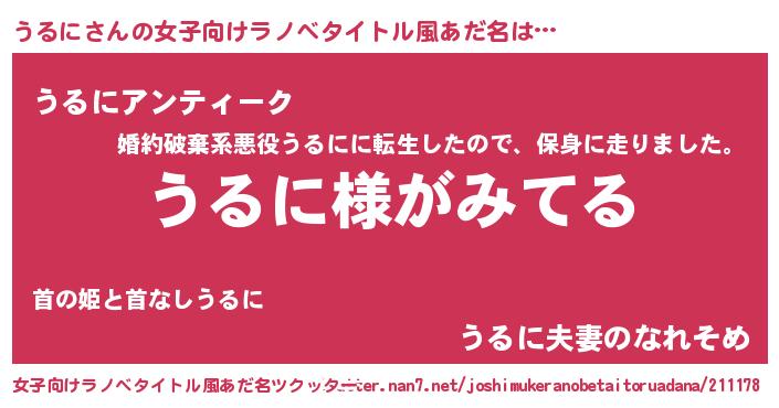 | 男性向けラノベタイトル風あだ名 | 『うるにの嫁は女の子じゃないと思った?』 |