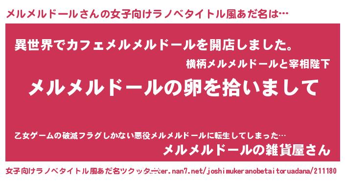 | 男性向けラノベタイトル風あだ名 | 『メルメルドールの嫁は女の子じゃないと思った?』 |