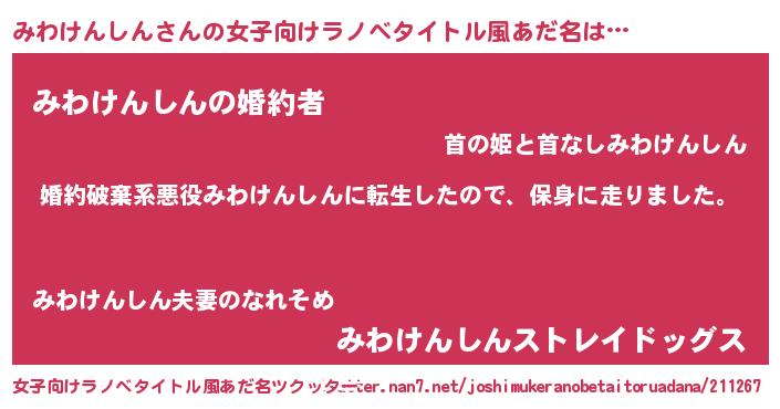 | 男性向けラノベタイトル風あだ名 | 『ミワケンシンスレイヤー』 |