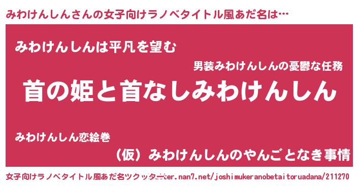 | 男性向けラノベタイトル風あだ名 | 『はたらくみわけんしんさま!』 |