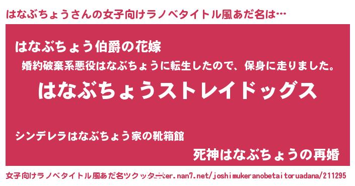 | 男性向けラノベタイトル風あだ名 | 『Re:はなぶちょうから始める異世界生活』 |