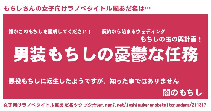 | 男性向けラノベタイトル風あだ名 | 『うちのもちしが世界を掌握している!』 |