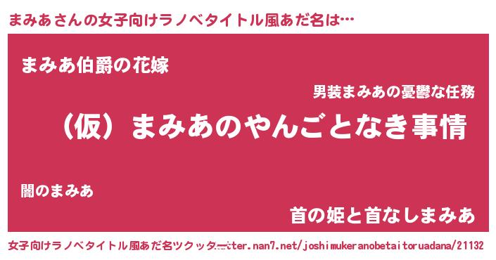 | 男性向けラノベタイトル風あだ名 | 『まみあの憂鬱』『はたらくまみあさま!』 |