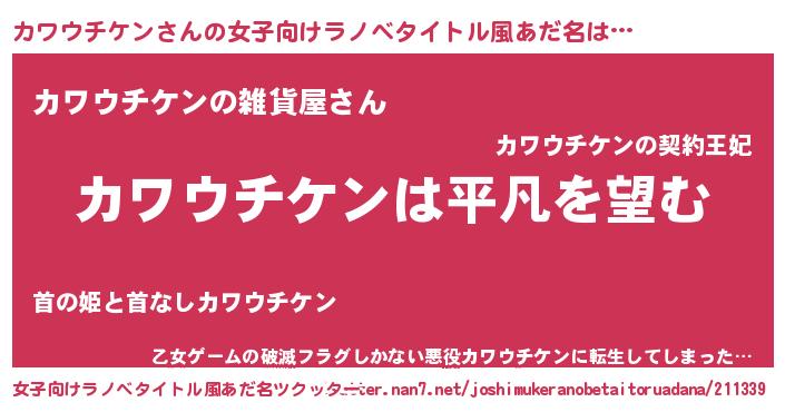 | 男性向けラノベタイトル風あだ名 | 『ダンジョンにカワウチケンを求めるのは間違っているだろうか』 |