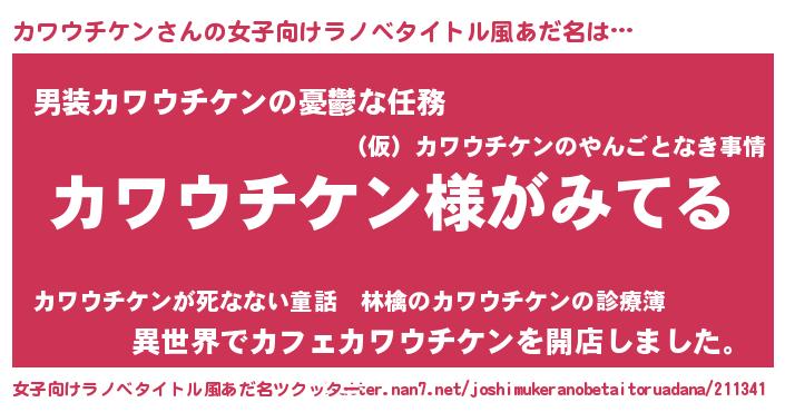 | 男性向けラノベタイトル風あだ名 | 『カワウチケンの嫁は女の子じゃないと思った?』 |
