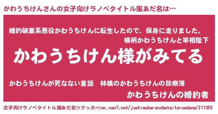 | 男性向けラノベタイトル風あだ名 | 『かわうちけんの嫁は女の子じゃないと思った?』 |