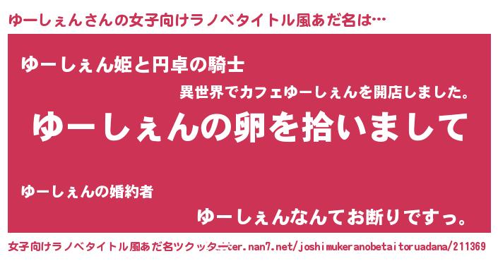 | 男性向けラノベタイトル風あだ名 | 『ダンジョンにゆーしぇんを求めるのは間違っているだろうか』 |