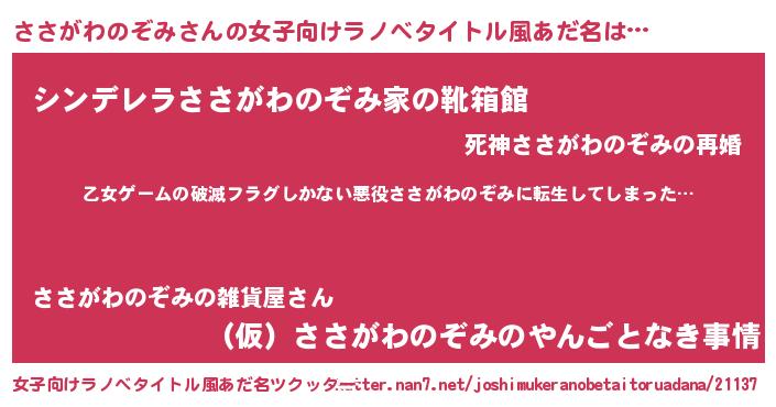| 男性向けラノベタイトル風あだ名 | 『この素晴らしい世界にささがわのぞみを!』 |