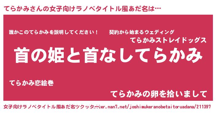 てらかみさんの女子向けラノベタイトル風あだ名は… 『首の姫と首なしてらかみ』『誰かこのてらかみを説明してください! ~契約から始まるウェディング~』『てらかみの卵を拾いまして』 ツクッター #女子向けラノベタイトル風あだ名ツクッター http://tkutter.nan7.net/joshimukeranobetaitoruadana/211397/