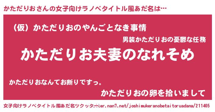 | 男性向けラノベタイトル風あだ名 | 『おまえをオタクにしてやるから、俺をかただりおにしてくれ! 』 |