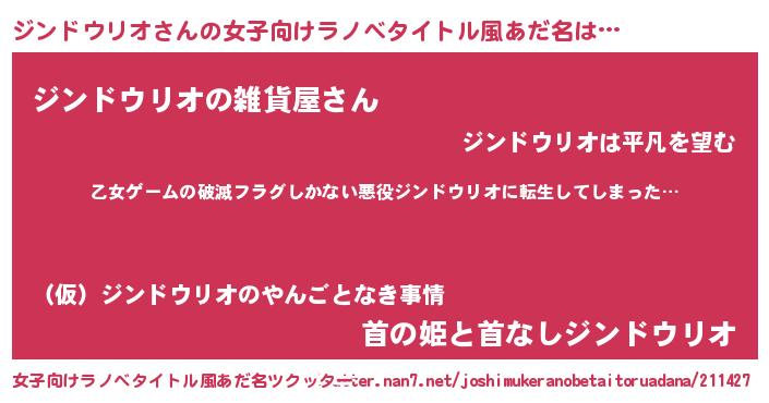 | 男性向けラノベタイトル風あだ名 | 『この素晴らしい世界にジンドウリオを!』 |