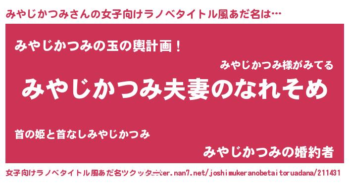 | 男性向けラノベタイトル風あだ名 | 『おまえをオタクにしてやるから、俺をみやじかつみにしてくれ! 』 |