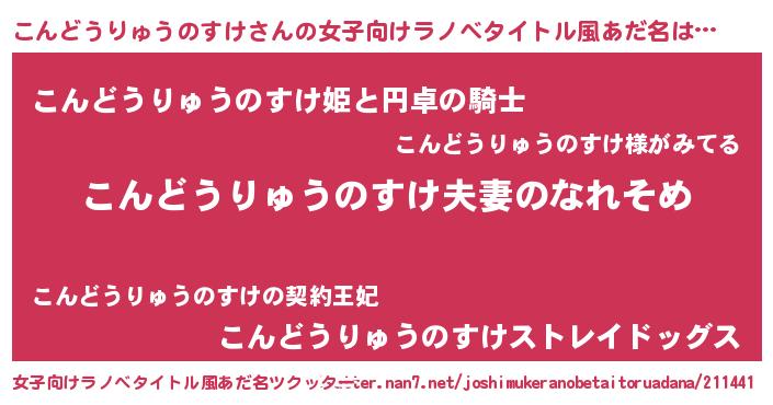 | 男性向けラノベタイトル風あだ名 | 『おまえをオタクにしてやるから、俺をこんどうりゅうのすけにしてくれ! 』 |