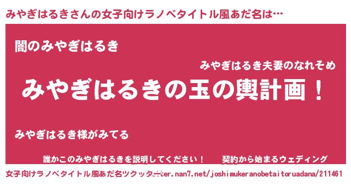 | 男性向けラノベタイトル風あだ名 | 『みやぎはるき~年齢イコール彼女いない歴の魔法使い~』 |