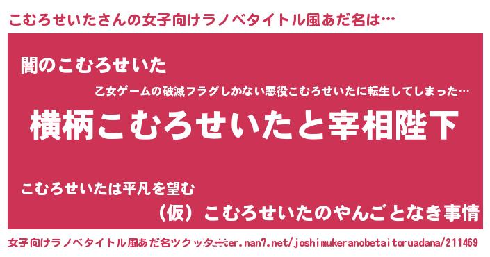 | 男性向けラノベタイトル風あだ名 | 『こむろせいたに滅ぼされるだけの簡単なお仕事です』 |