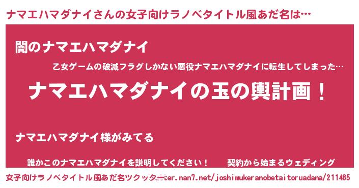| 男性向けラノベタイトル風あだ名 | 『ナマエハマダナイ~年齢イコール彼女いない歴の魔法使い~』 |