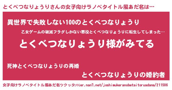 | 男性向けラノベタイトル風あだ名 | 『とくべつなりょうりの嫁は女の子じゃないと思った?』 |
