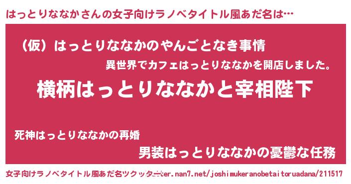 | 男性向けラノベタイトル風あだ名 | 『はっとりななかに滅ぼされるだけの簡単なお仕事です』 |