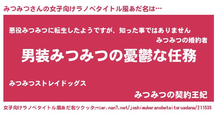 | 男性向けラノベタイトル風あだ名 | 『うちのみつみつが世界を掌握している!』 |