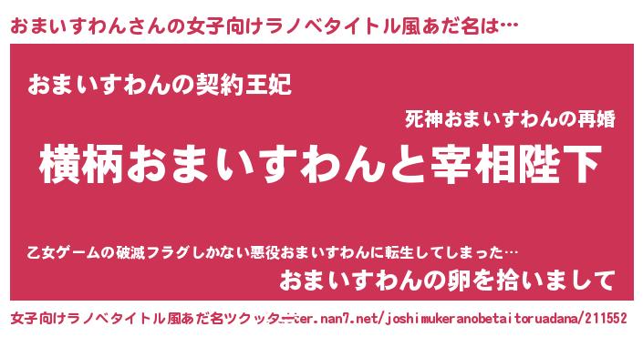 | 男性向けラノベタイトル風あだ名 | 『おまいすわんに滅ぼされるだけの簡単なお仕事です』 |