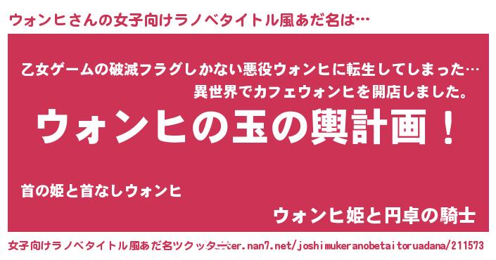 | 男性向けラノベタイトル風あだ名 | 『ウォンヒ~年齢イコール彼女いない歴の魔法使い~』 |