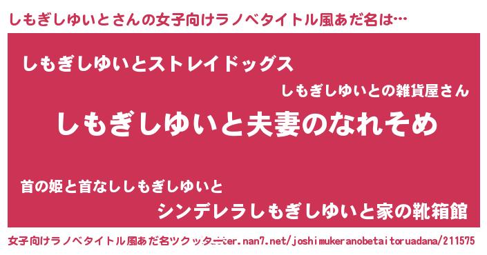 | 男性向けラノベタイトル風あだ名 | 『おまえをオタクにしてやるから、俺をしもぎしゆいとにしてくれ! 』 |