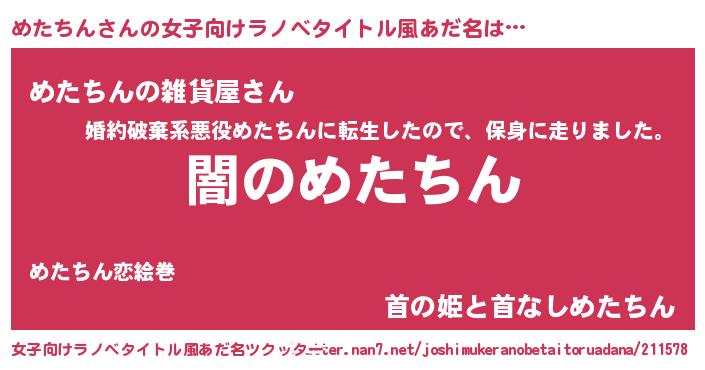 | 男性向けラノベタイトル風あだ名 | 『Re:めたちんから始める異世界生活』 |