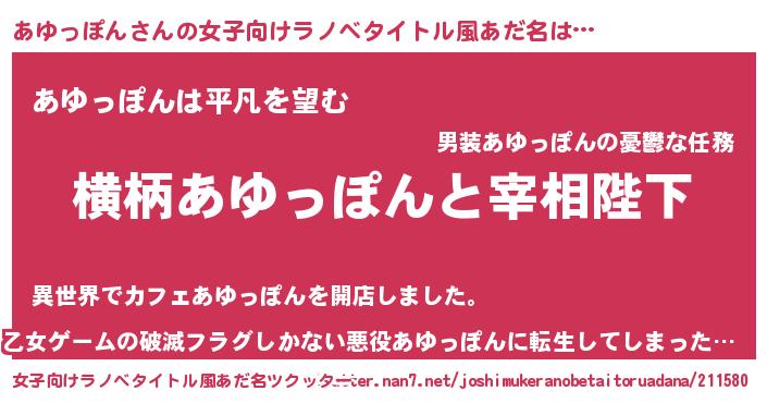 | 男性向けラノベタイトル風あだ名 | 『あゆっぽんに滅ぼされるだけの簡単なお仕事です』 |