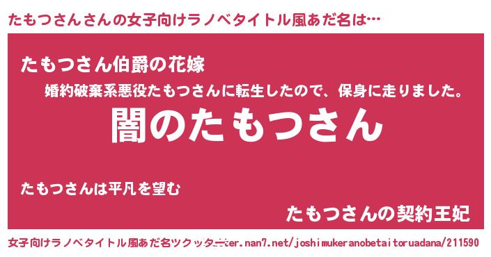 | 男性向けラノベタイトル風あだ名 | 『Re:たもつさんから始める異世界生活』 |