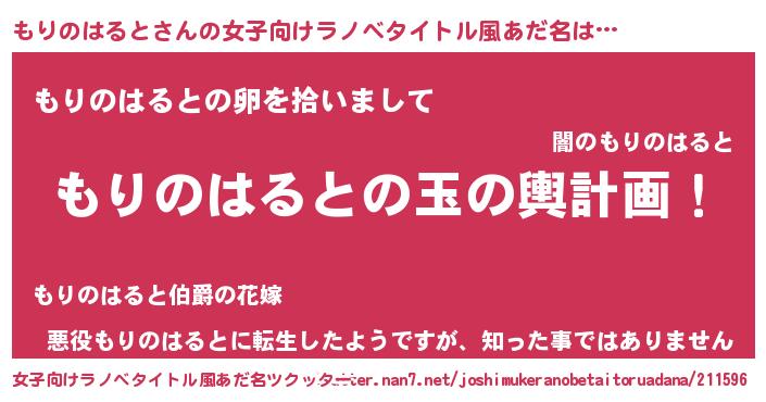 | 男性向けラノベタイトル風あだ名 | 『もりのはると~年齢イコール彼女いない歴の魔法使い~』 |
