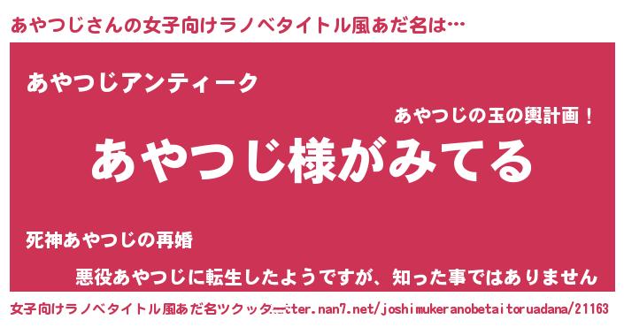 | 男性向けラノベタイトル風あだ名 | 『あやつじの嫁は女の子じゃないと思った?』 |