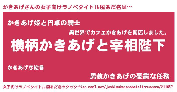 | 男性向けラノベタイトル風あだ名 | 『かきあげに滅ぼされるだけの簡単なお仕事です』 |