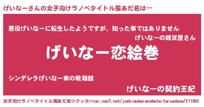 | 男性向けラノベタイトル風あだ名 | 『おまえをオタクにしてやるから、俺をげいなーにしてくれ! 』 |