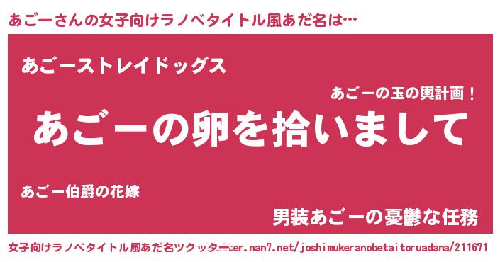| 男性向けラノベタイトル風あだ名 | 『あごーの嫁は女の子じゃないと思った?』 |