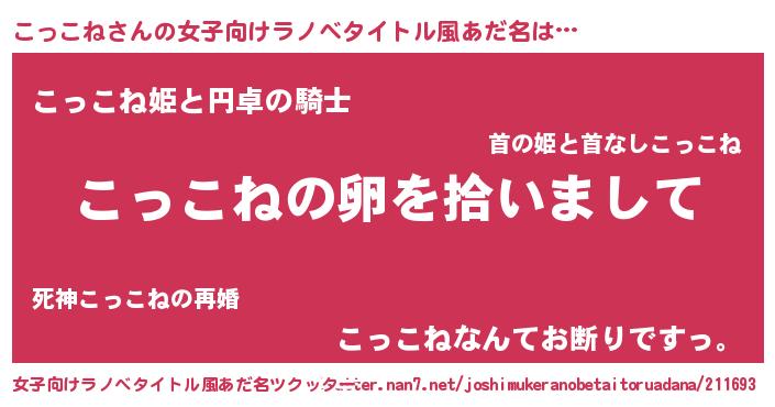 | 男性向けラノベタイトル風あだ名 | 『ダンジョンにこっこねを求めるのは間違っているだろうか』 |