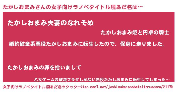 | 男性向けラノベタイトル風あだ名 | 『転生したらたかしおまみだった件』 |