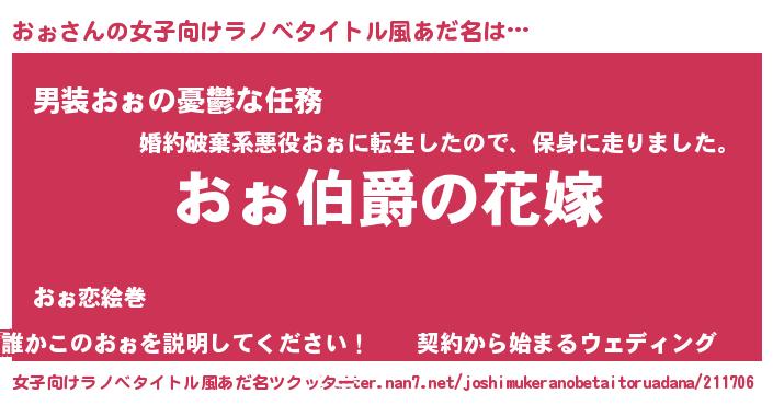 | 男性向けラノベタイトル風あだ名 | 『うちの娘の為ならば、俺はもしかしたらおぉも倒せるかもしれない。』 |