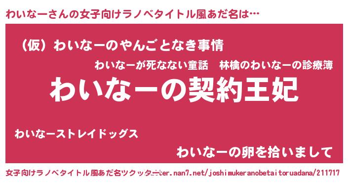 | 男性向けラノベタイトル風あだ名 | 『誰もが恐れるあのわいなーが、ぼくの専属メイドになるようです。』 |